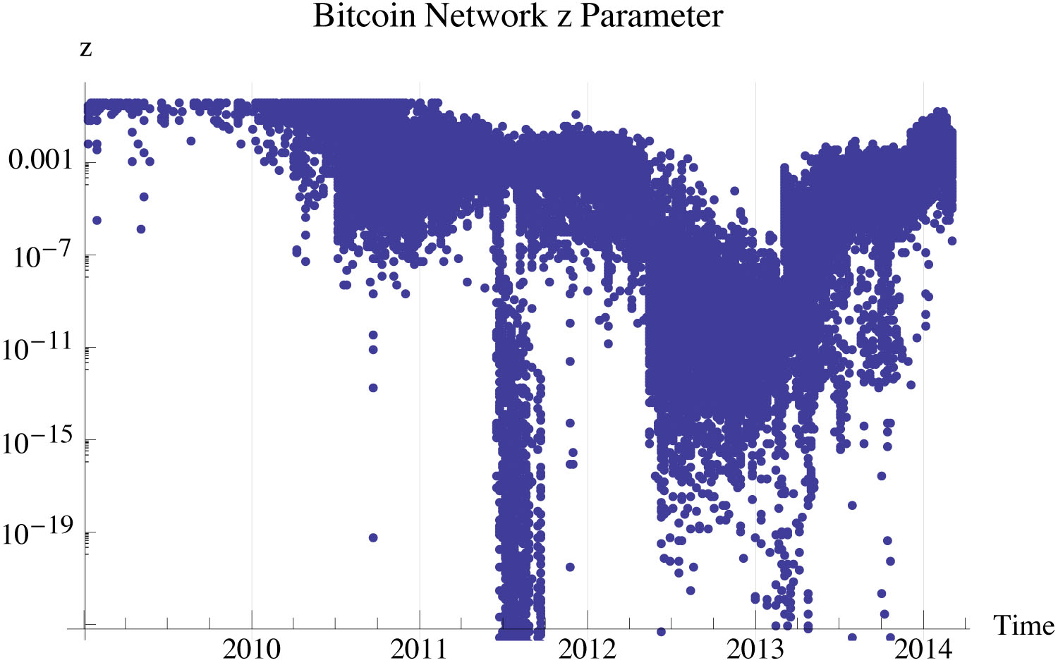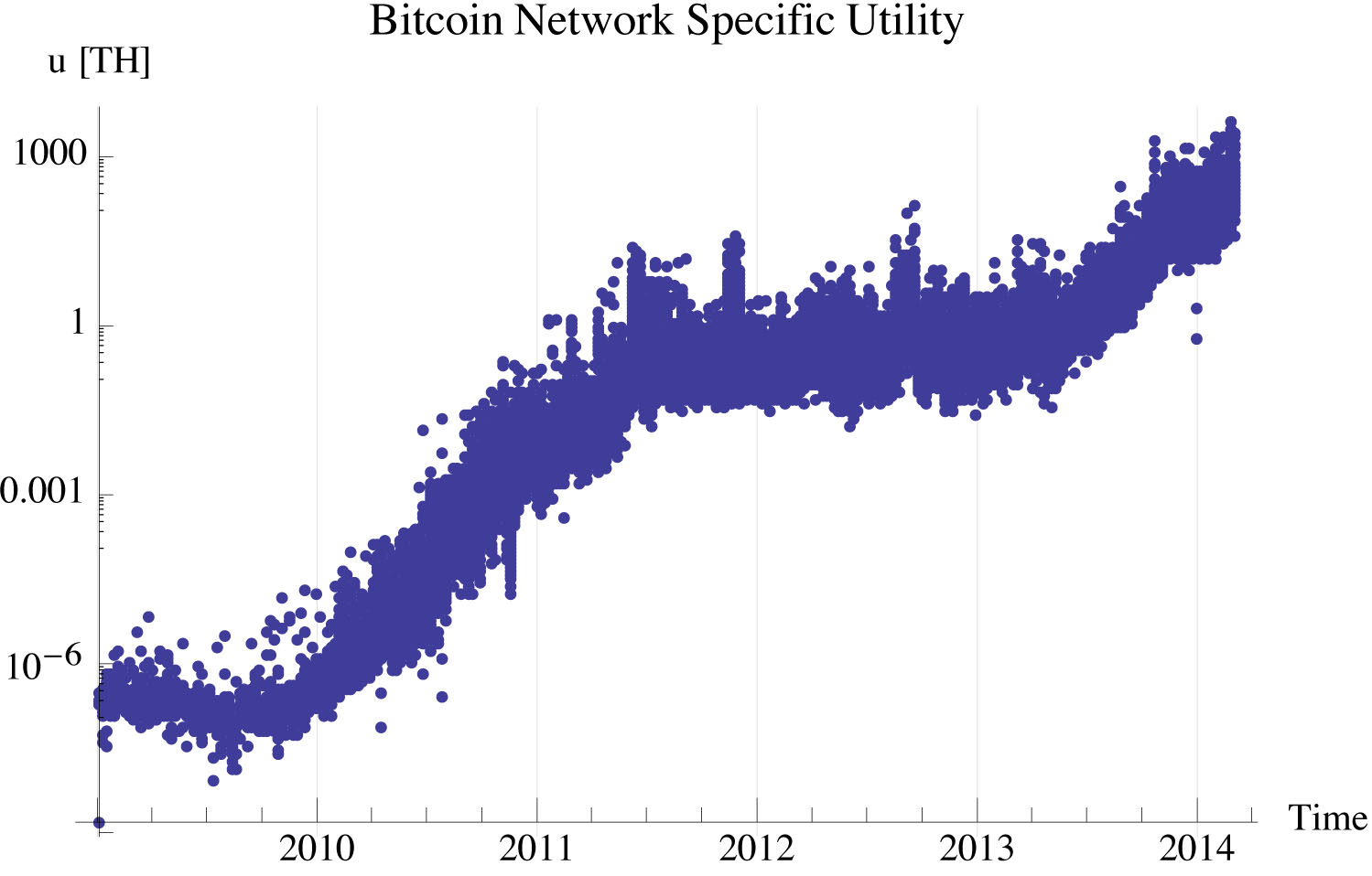 . Under the constraints of Bitcoin, miners work for a specific payout of bitcoins, the coinbase. How hard they work to do this is the time taken to discover the next block. In this context, mining acts to determine the marginal utility of finding the next bitcoin. Figure 1 shows the marginal utility of bticoin measured, using the aggregate information every 6 blocks, approximately hourly. The study period is from the genesis block through block 289207. We express the units of bitcoin pressure as TH/BTC, terahash/bitcoin.